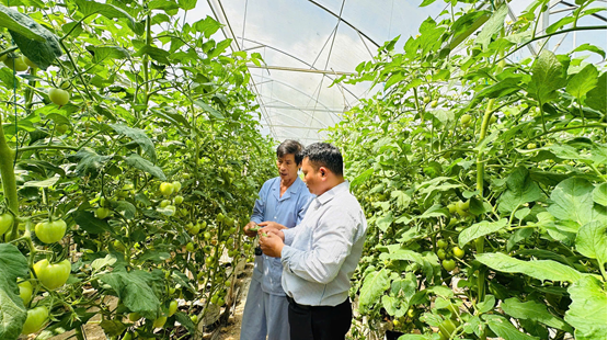 Anh Nguyễn Đình Mẫu (áo xanh) đang trao đổi, chia sẻ với anh Ha Nan Tha My - Chủ tịch Hội Nông dân xã Ninh Gia về mô hình trồng cà chua giống Rita