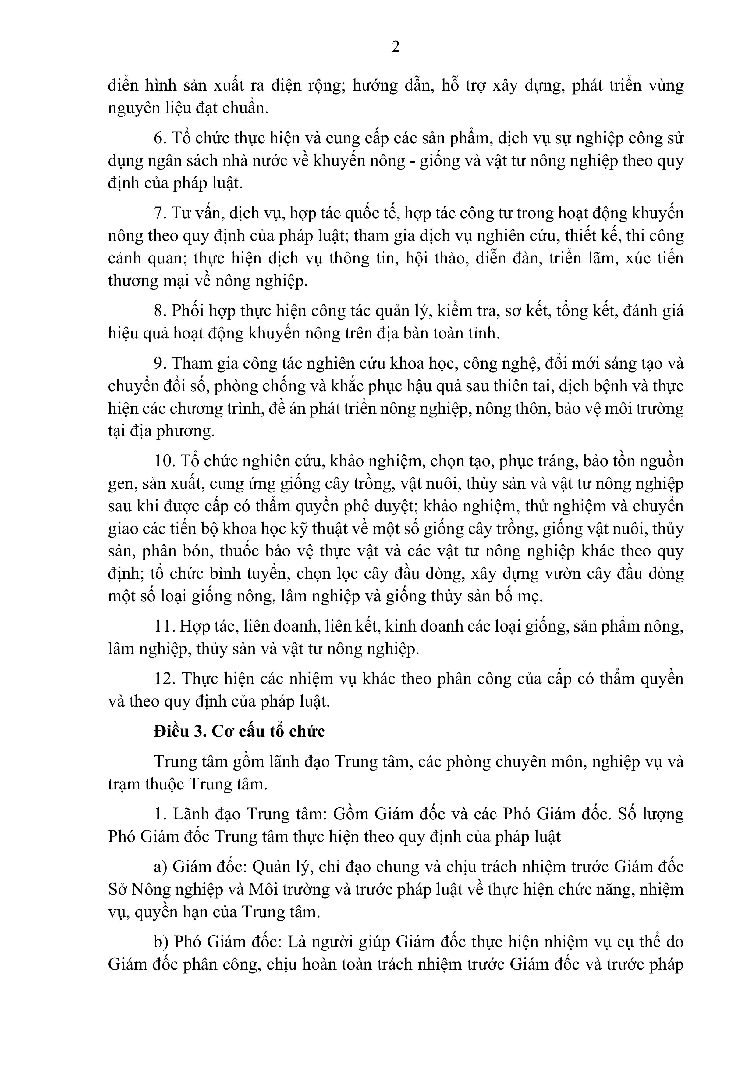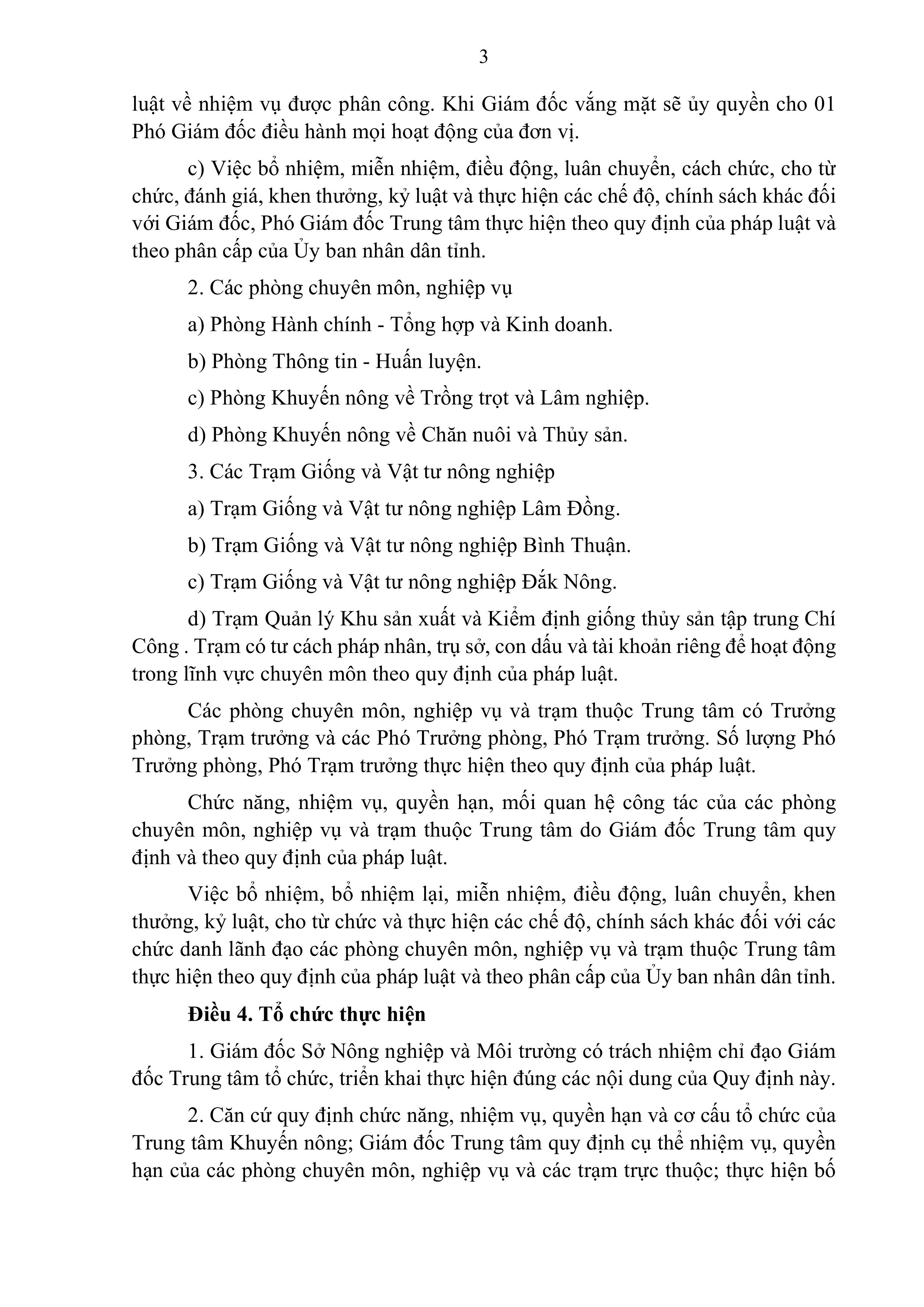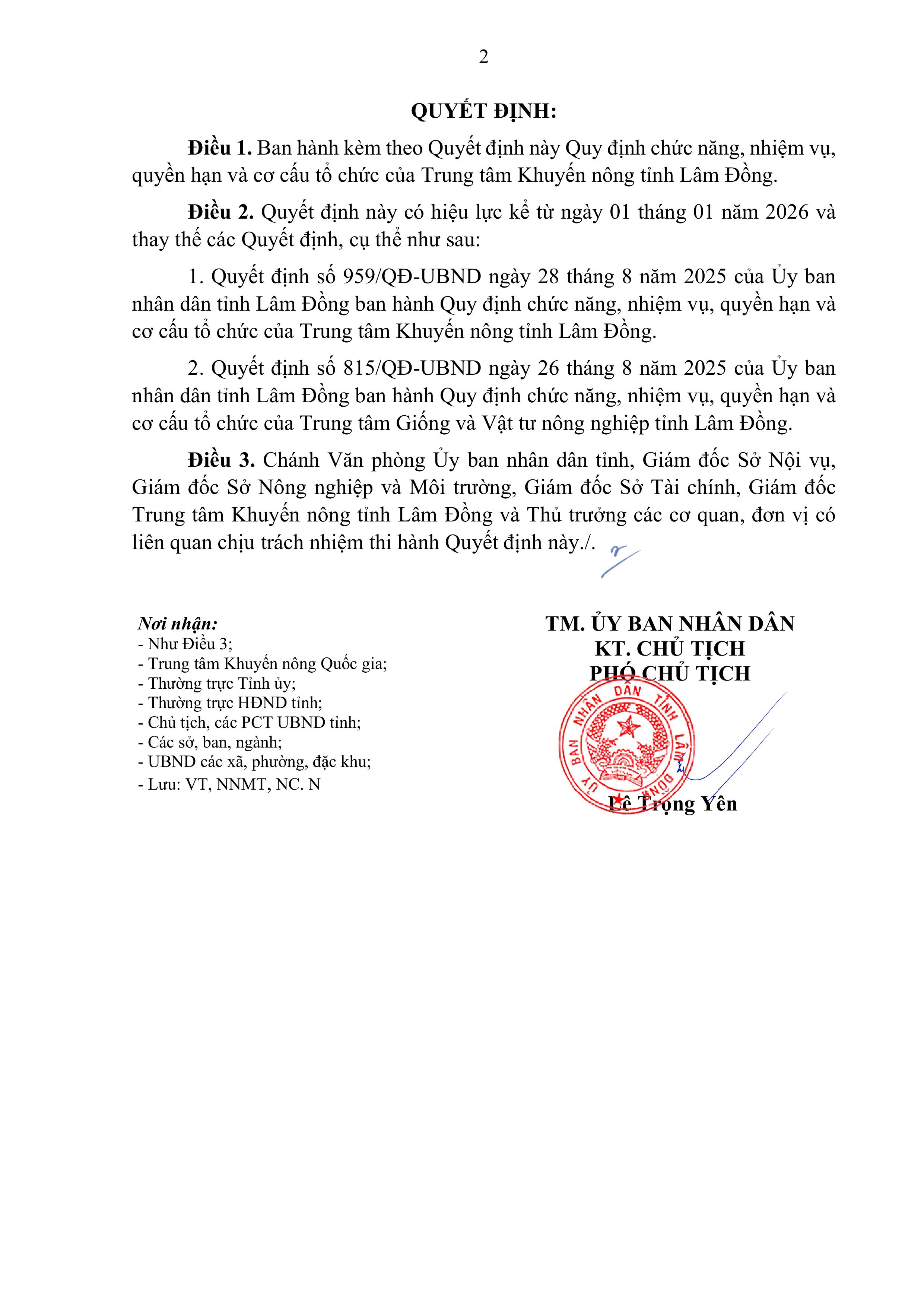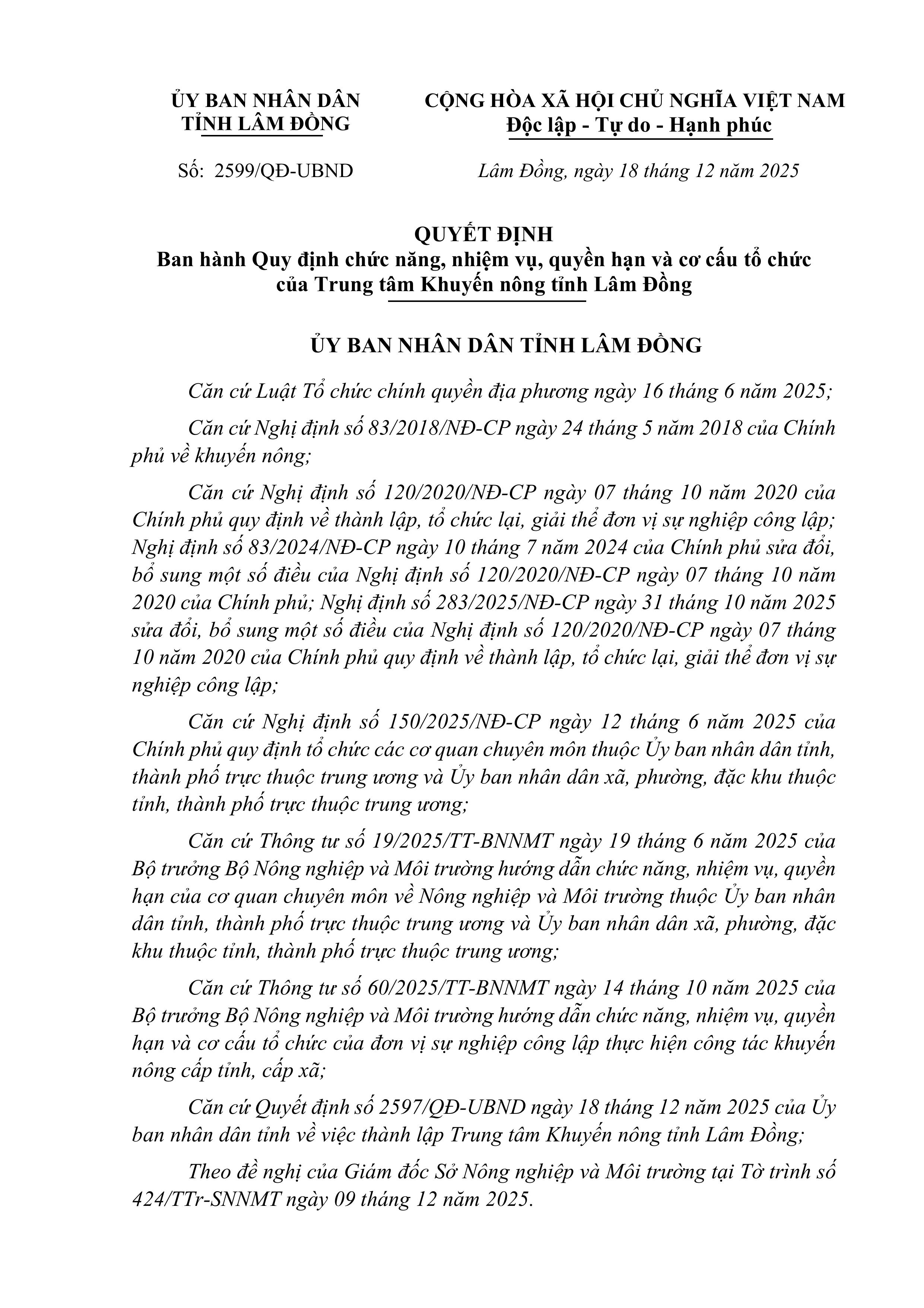 Căn cứ theo Quyết định số 2599/QĐ-UBND ngày 18 tháng 12 năm 2025 của UBND tỉnh Lâm Đồng “V/v Quy định chức năng, nhiệm vụ, quyền hạn và cơ cấu tổ chức của Trung tâm Khuyến nông tỉnh Lâm Đồng”. Chức năng, nhiệm vụ, quyền hạn và cơ cấu tổ chức của Trung tâm Khuyến nông được quy định cụ thể theo file đính kèm...