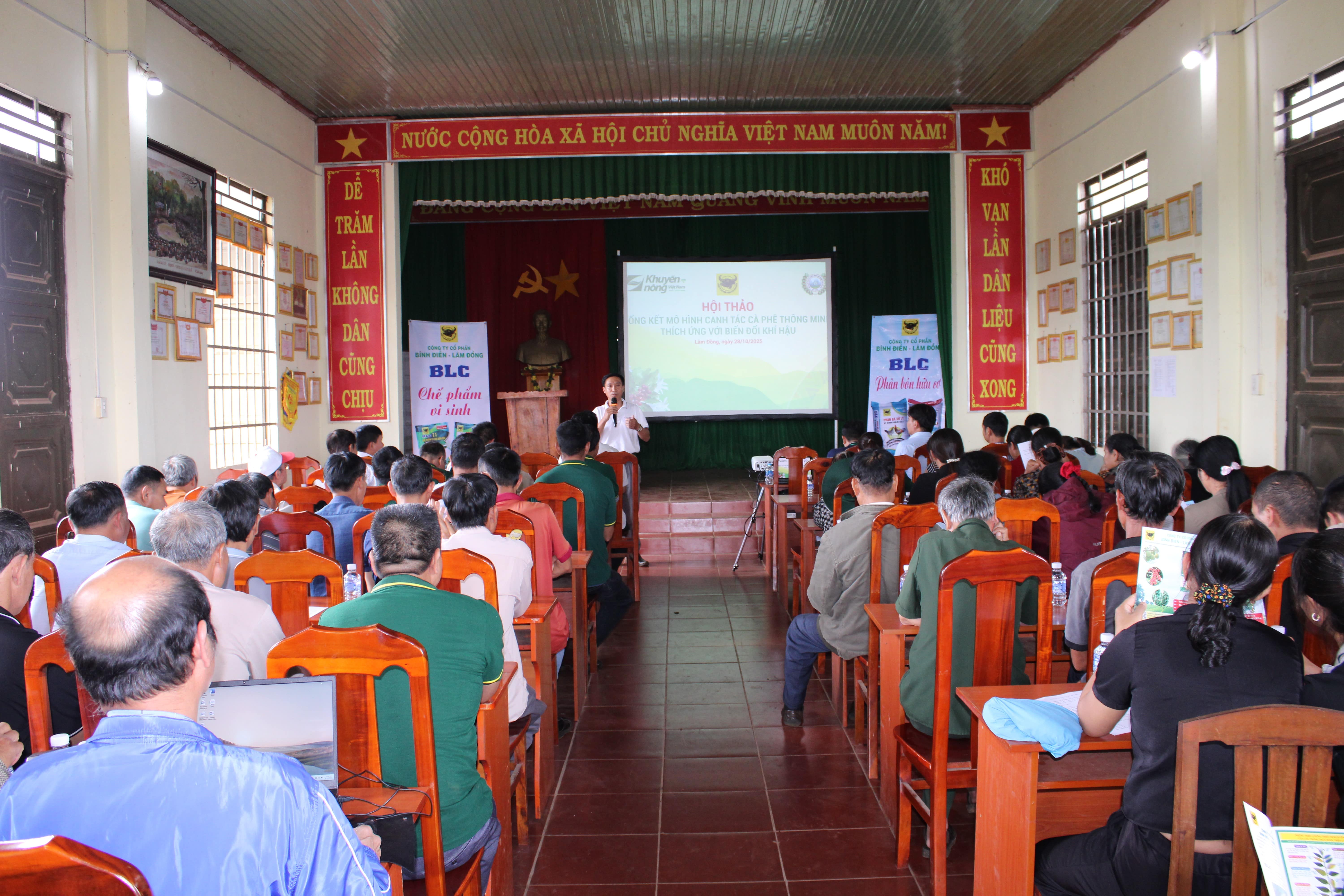 Ngày 28/10/2025, tại xã Tân Hà Lâm Hà, Viện Khoa học Kỹ thuật Nông Lâm nghiệp Tây Nguyên phối hợp cùng Trung tâm Khuyến nông tỉnh Lâm Đồng và Công ty Cổ phần Phân bón Bình Điền tổ chức Hội thảo tổng kết mô hình “Canh tác cà phê thông minh thích ứng với biến đổi khí hậu năm 2025”.