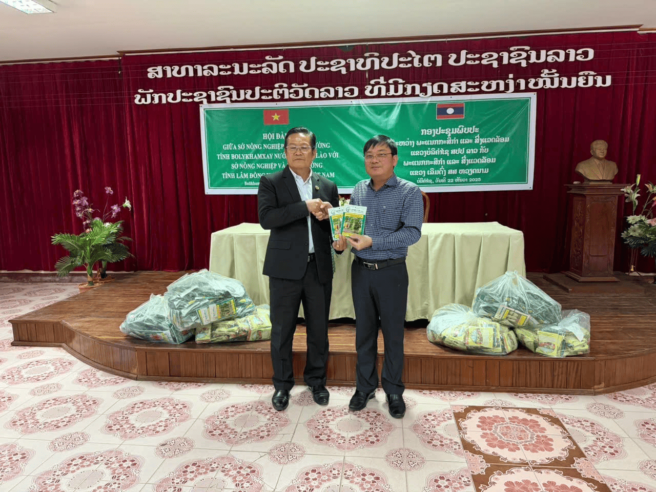 Ông Nguyễn Hoàng Phúc - Phó Giám đốc Sở Nông nghiệp và Môi trường tỉnh Lâm Đồng trao tặng hạt giống rau cho Sở Nông nghiệp và Môi trường tỉnh Bolykhamxay