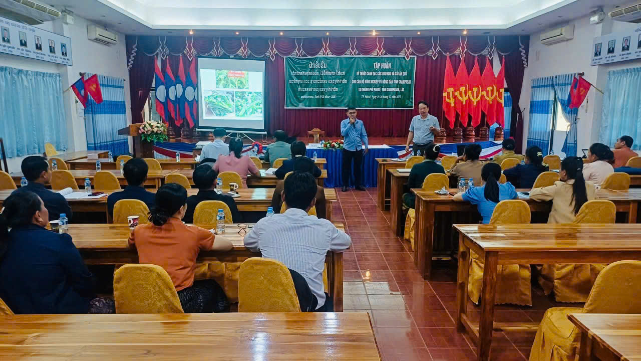Tại tỉnh Champasak, đoàn công tác của tỉnh Lâm Đồng do ông Nguyễn Hoàng Phúc - Phó Giám đốc Sở Nông nghiệp và Môi trường làm trưởng đoàn, đã làm việc với lãnh đạo Sở Nông nghiệp và Môi trường tỉnh Champasak, cùng đại diện các ngành chuyên môn và nông dân địa phương. Hai bên đánh giá cao kết quả triển khai Chương trình hợp tác nông nghiệp giai đoạn 2024 - 2025 giữa hai tỉnh, đồng thời khảo sát thực tế một số vùng sản xuất nông nghiệp nhằm làm cơ sở định hướng xây dựng kế hoạch hợp tác trong giai đoạn tiếp theo. Dịp này, đoàn công tác đã tổ chức tập huấn chuyển giao kỹ thuật canh tác rau và một số cây ăn quả cho gần 40 cán bộ kỹ thuật và nông dân, kết hợp lý thuyết với thực hành tại hiện trường sản xuất.