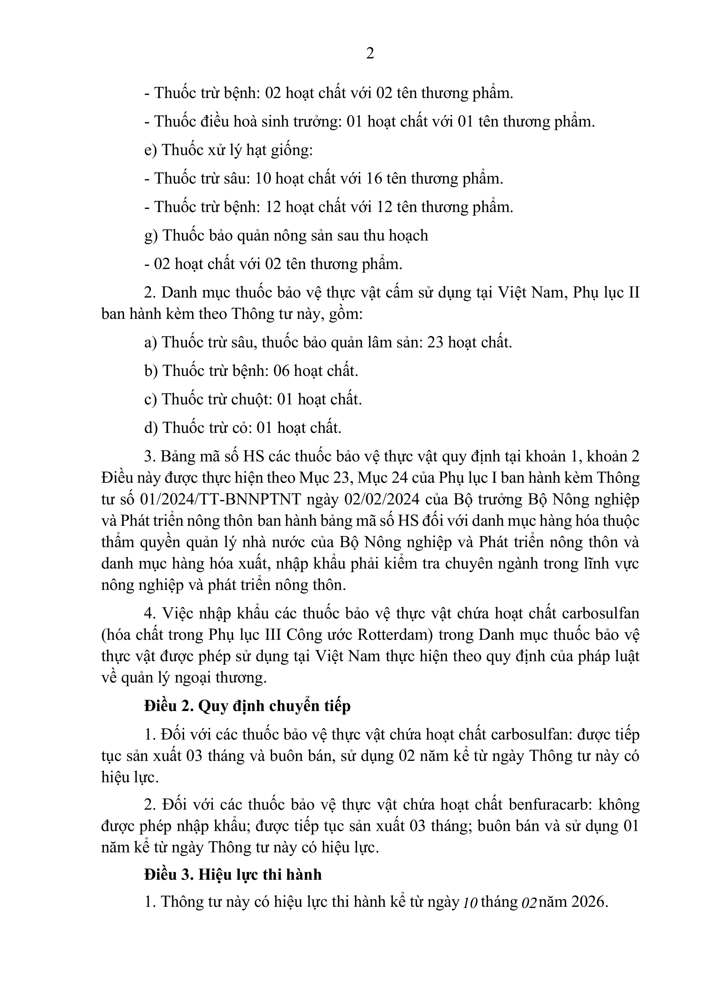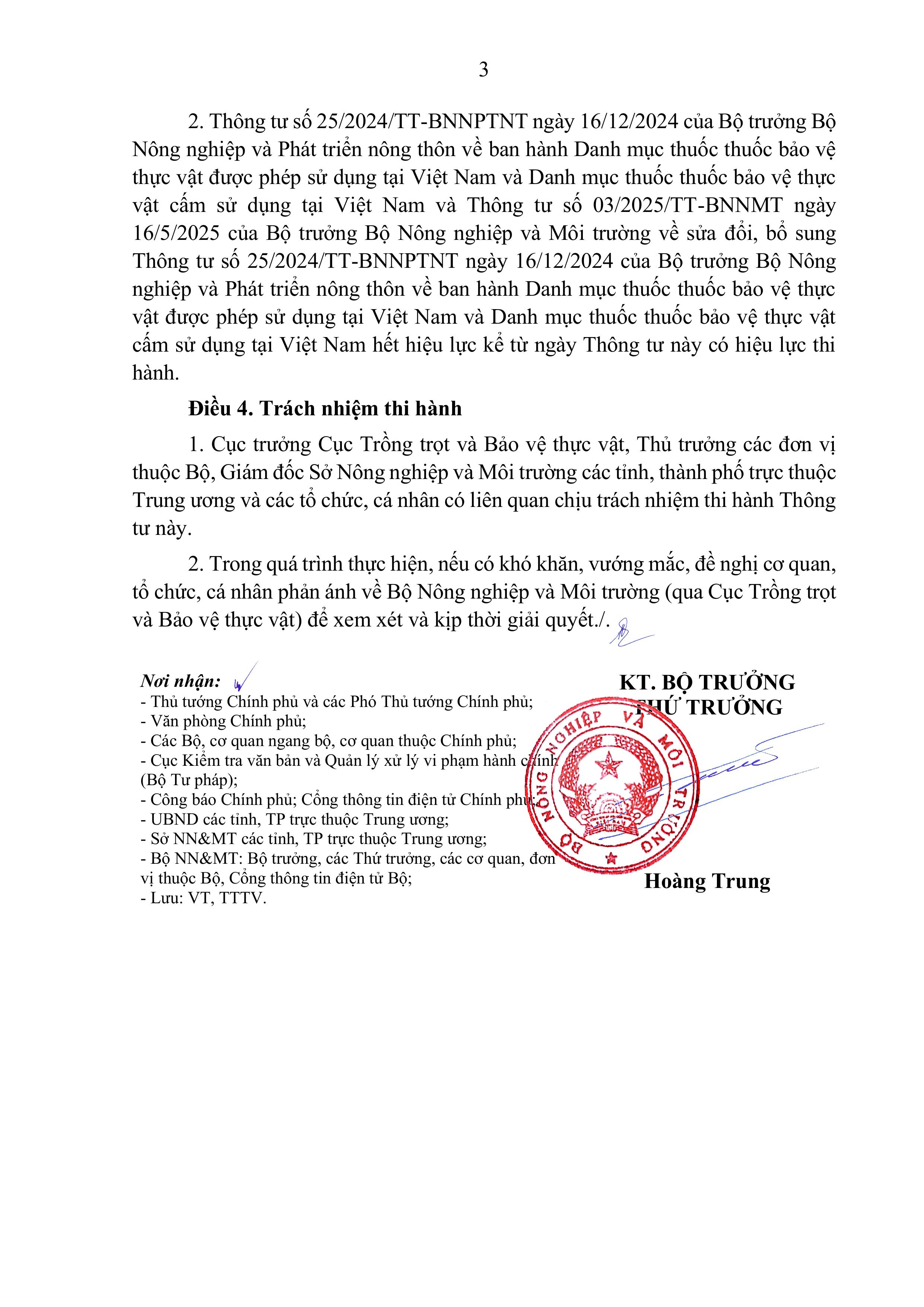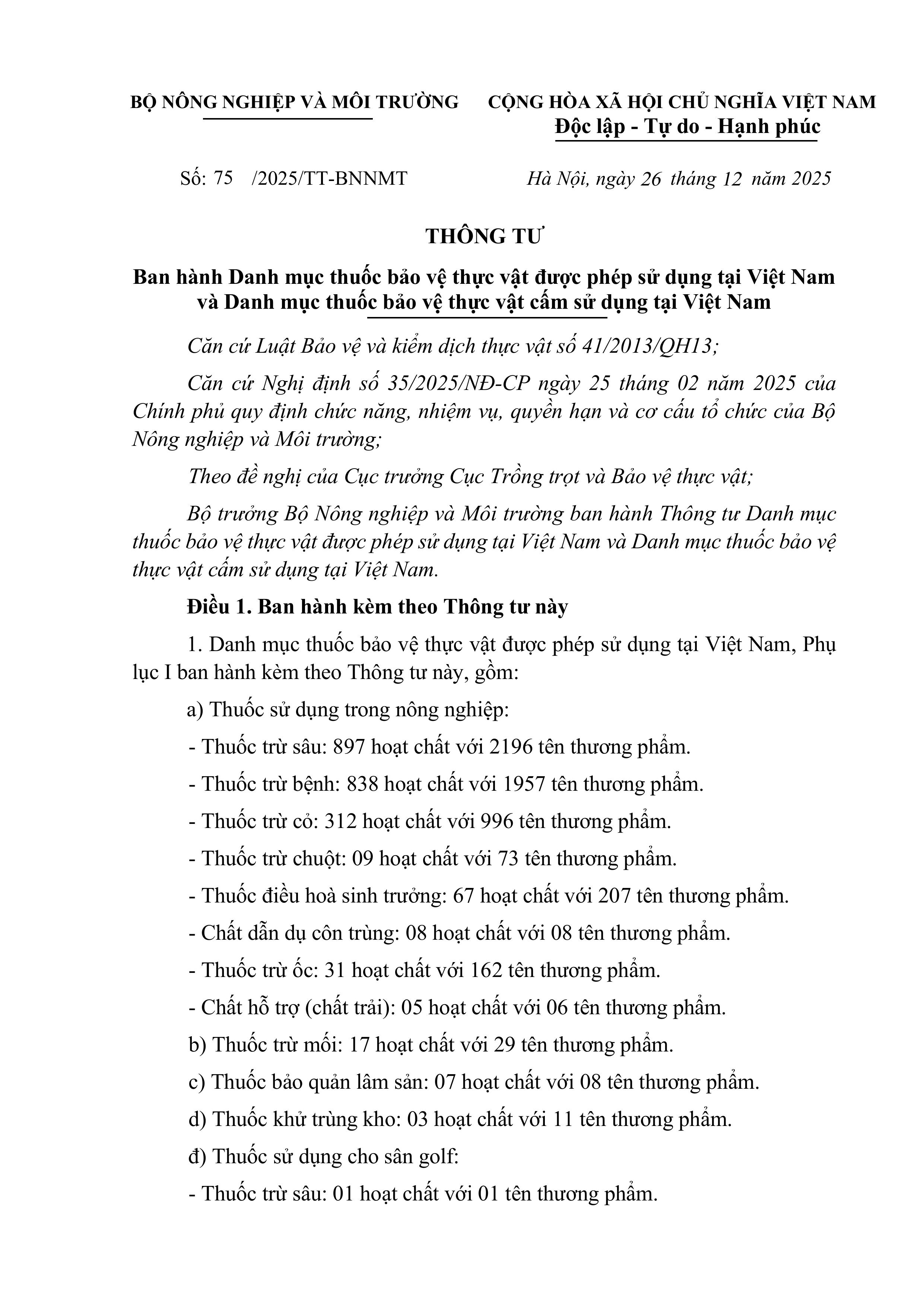 Ngày 26/12/2025, Bộ Nông nghiệp và Môi trường đã ban hành Thông tư 75/2025/TT-BNNMT về việc "Ban hành Danh mục thuốc bảo vệ thực vật được phép sử dụng tại Việt Nam và Danh mục thuốc bảo vệ thực vật cấm sử dụng tại Việt Nam".