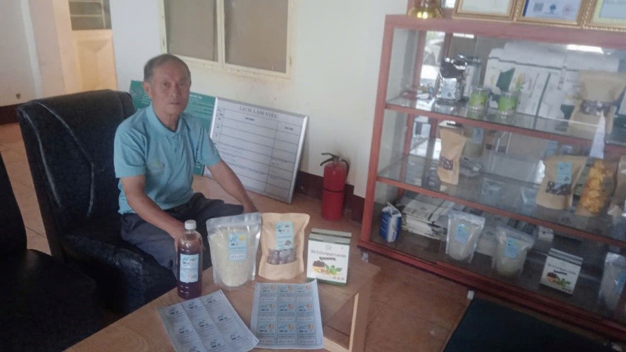Ông Phạm Văn Tuyên, HTX mắc ca Cao Nguyên Lâm Viên bên một số sản phẩm chế biến từ mắc ca