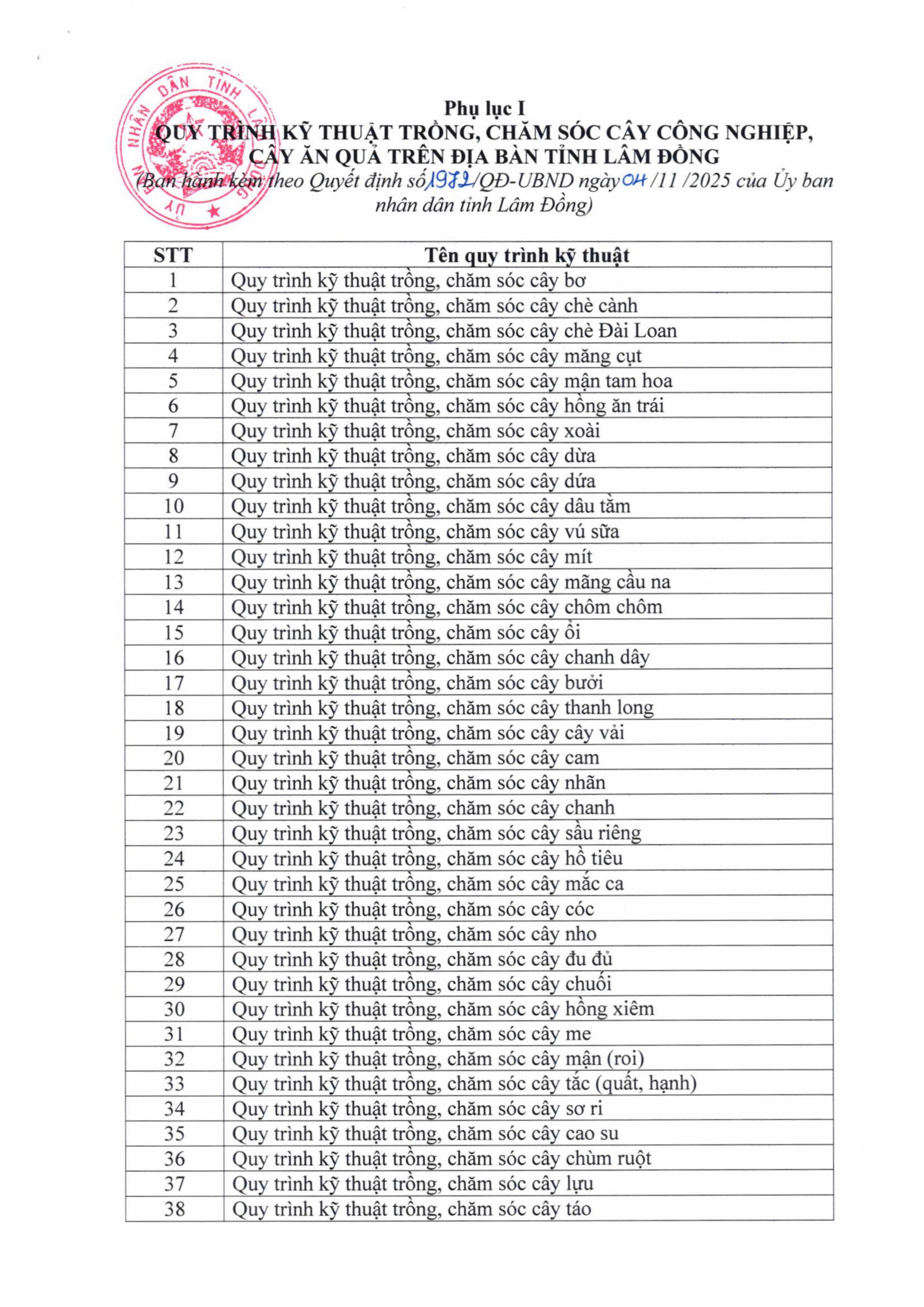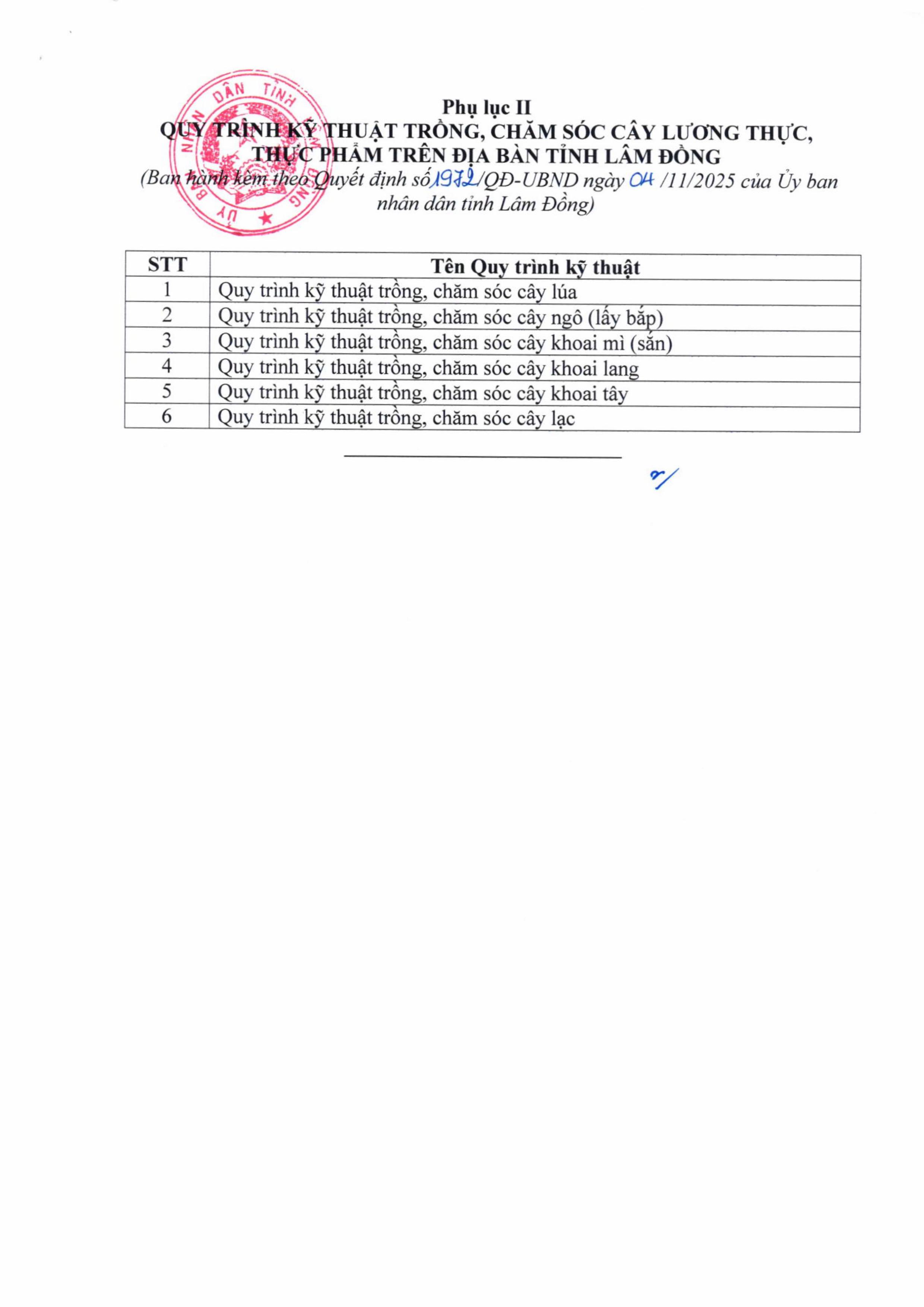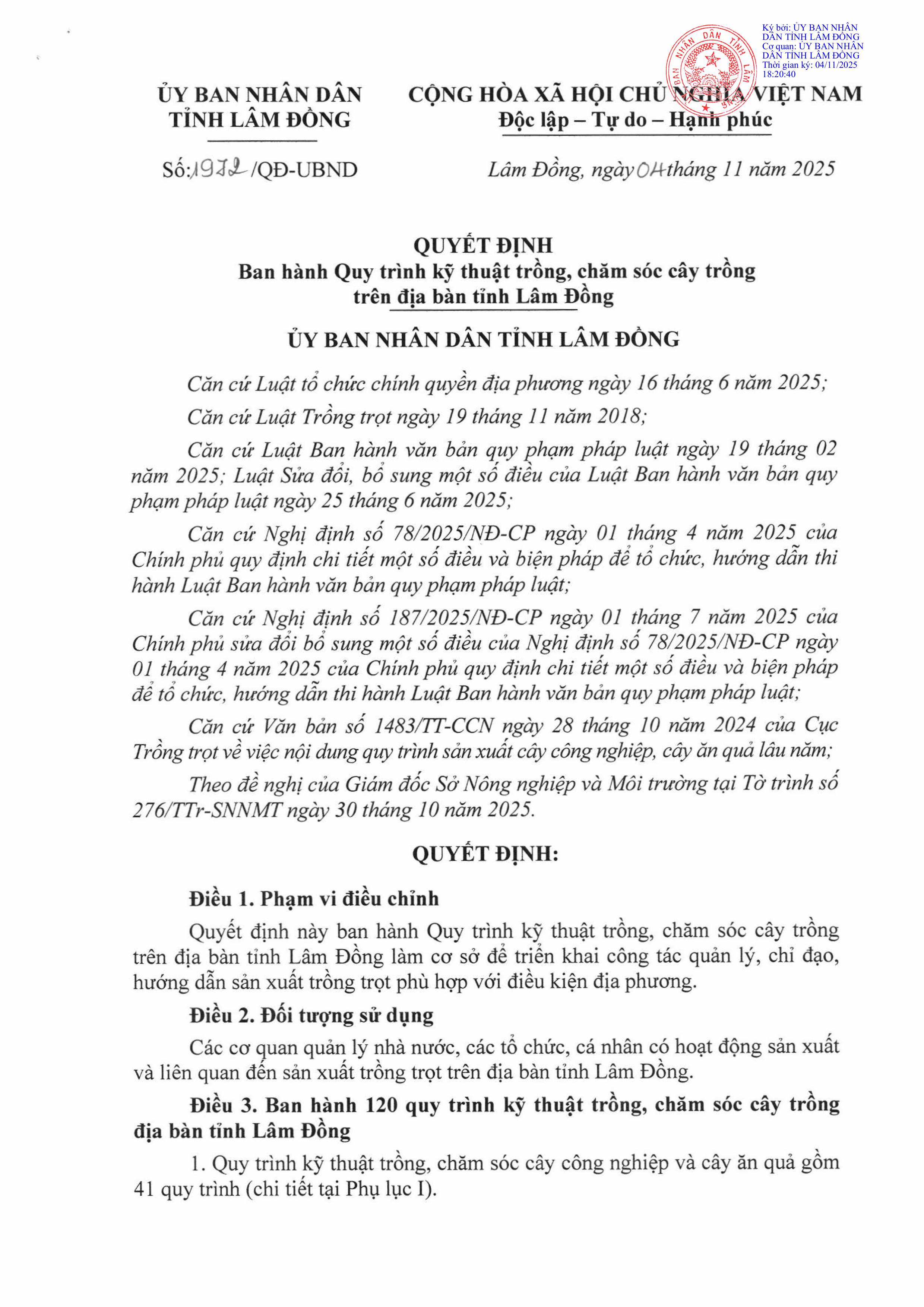 Ngày 04/11/2025, UBND tỉnh Lâm Đồng đã ban hành Quyết định số 1972/QĐ-UBND ban hành 120 quy trình kỹ thuật trồng, chăm sóc cây trồng địa bàn tỉnh Lâm Đồng.