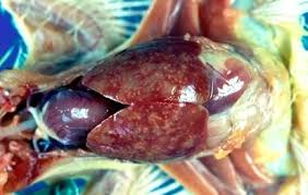 Bệnh tích: gan xuất huyết đầu đinh ghim màu đỏ, gan thoái hóa nên còn có đám tụ máu đỏ hoặc vàng.
