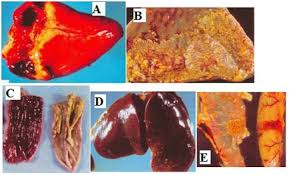 - Bệnh tích: viêm ruột xuất huyết, xuất huyết lấm tấm xếp theo những dải dài thực quản, lách giảm thể tích, gan sưng to thoái hóa, xuất huyết lấm tấm khắp cơ thể.