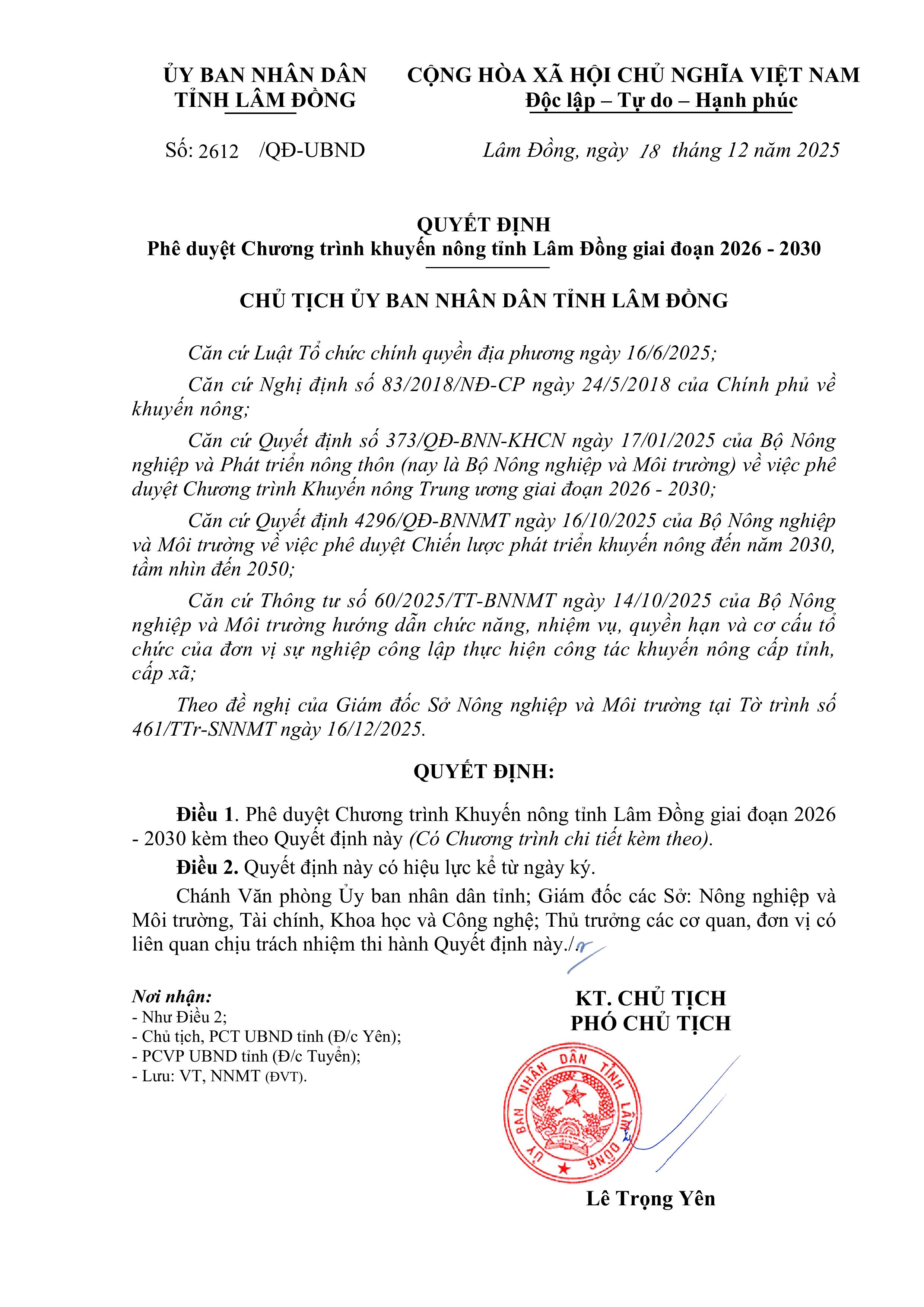Ngày 18/12/2025, UBND tỉnh Lâm Đồng đã ban hành Quyết định số 2612/QĐ-UBND về việc "Phê duyệt Chương trình Khuyến nông tỉnh Lâm Đồng giai đoạn 2026 - 2030".